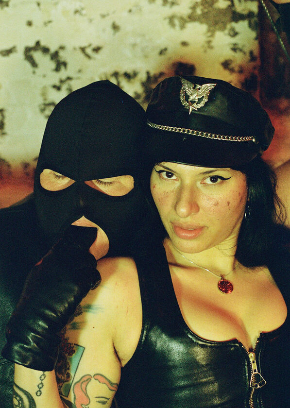 - Bondage with leather, metal, rope, and bandage-style restraint